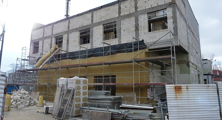 Na razie trwają prace przy rozbudowie oddziału rehabilitacyjnego. Budynek został już powiększony, wymieniono też okna. Brakuje jeszcze dachu nad nową częścią, ocieplenia i wykończenia elewacji.